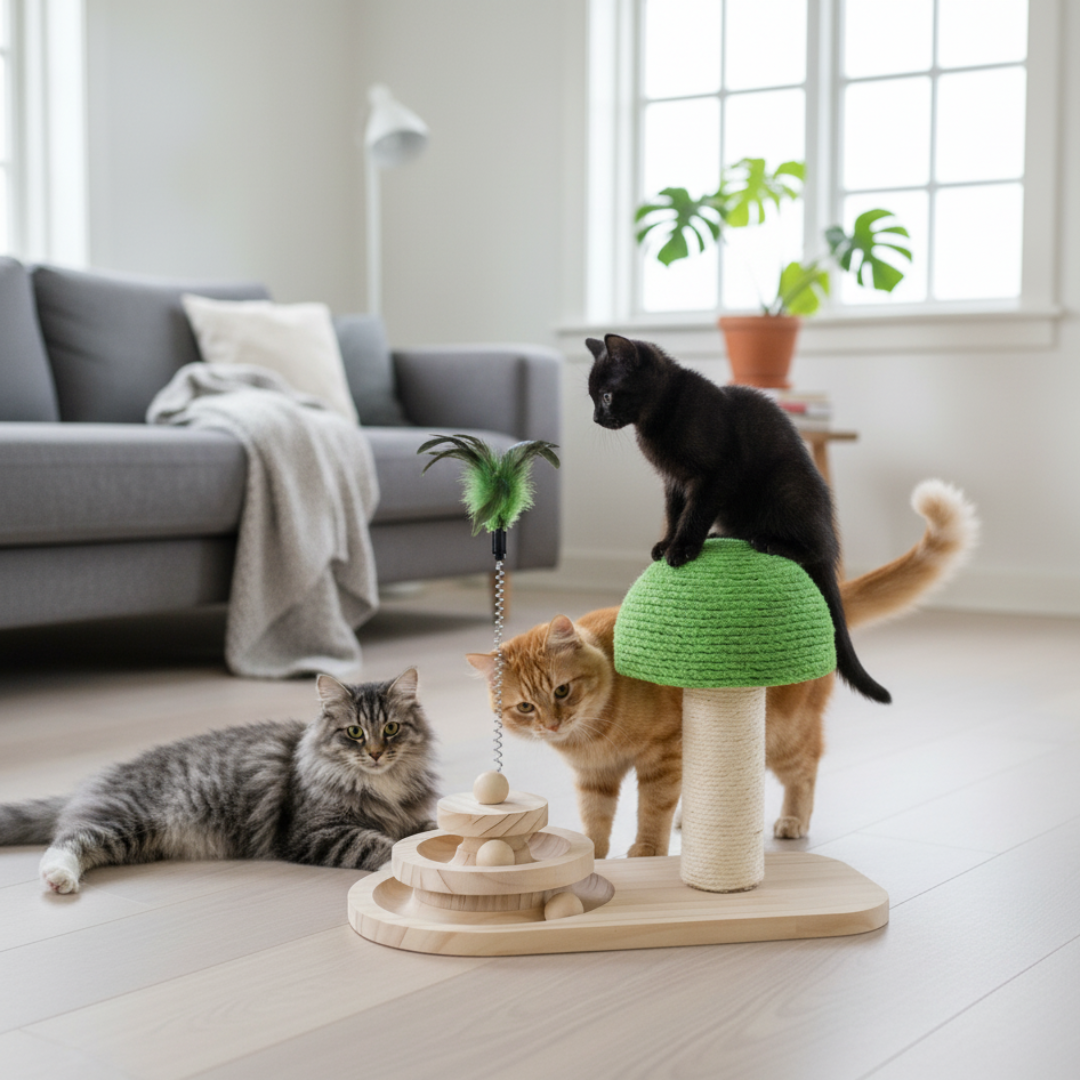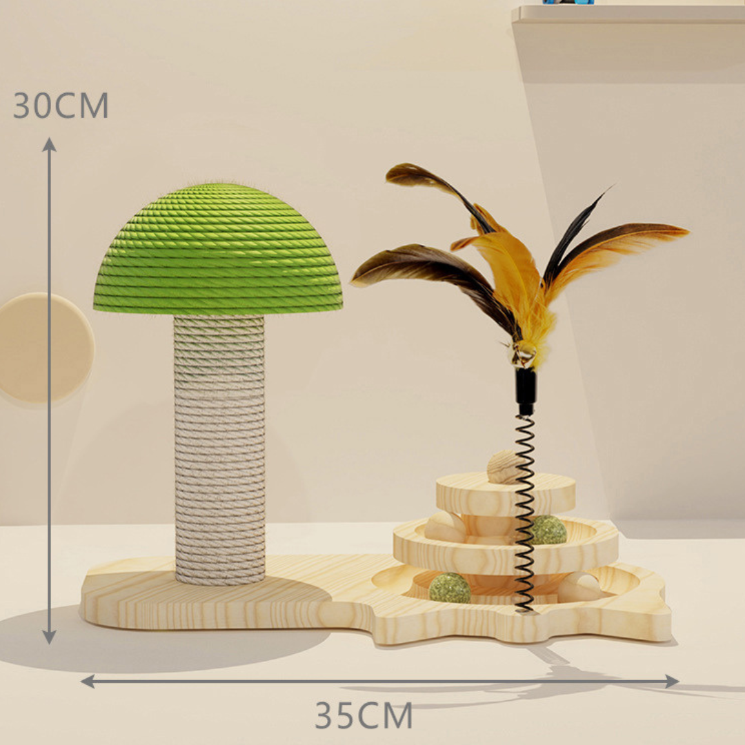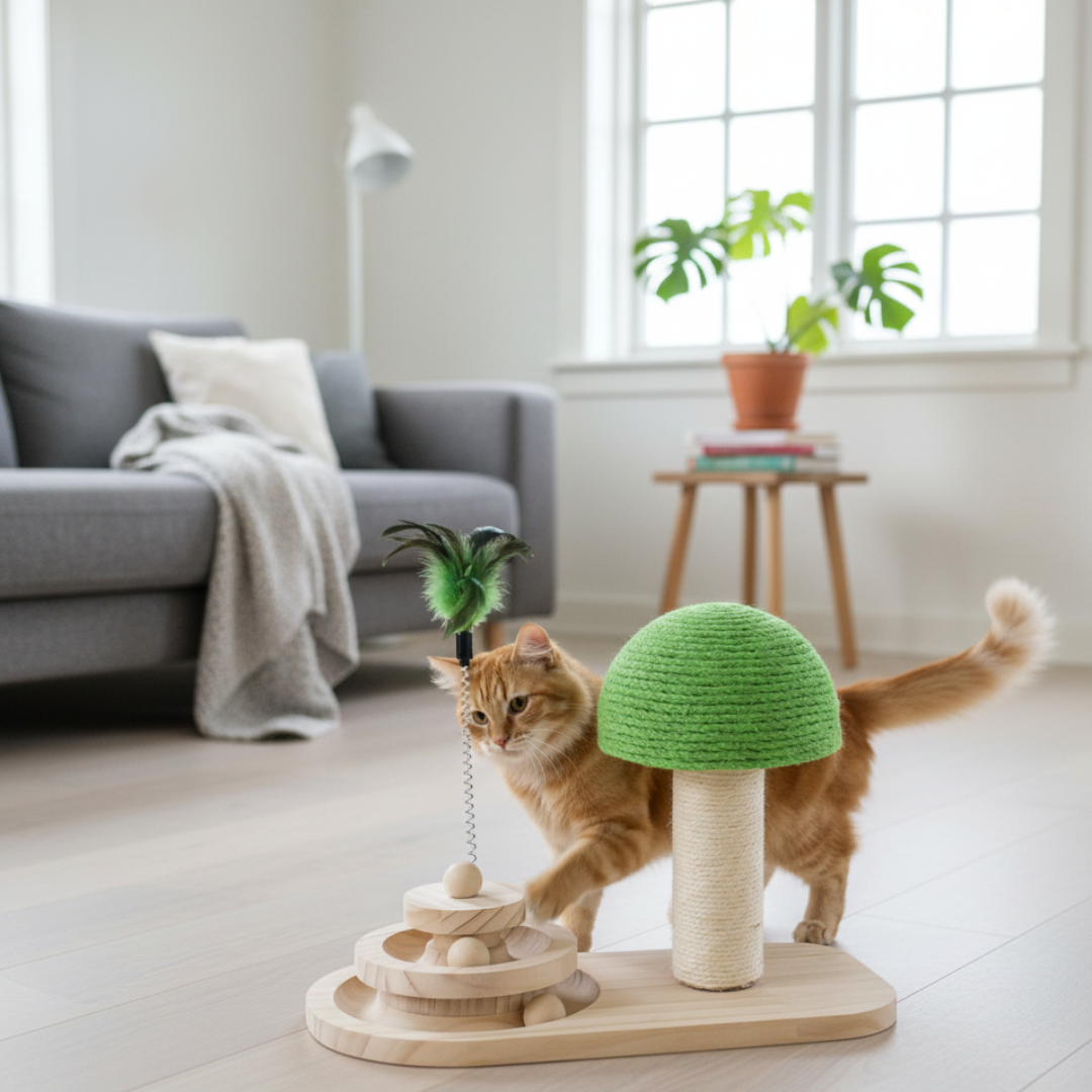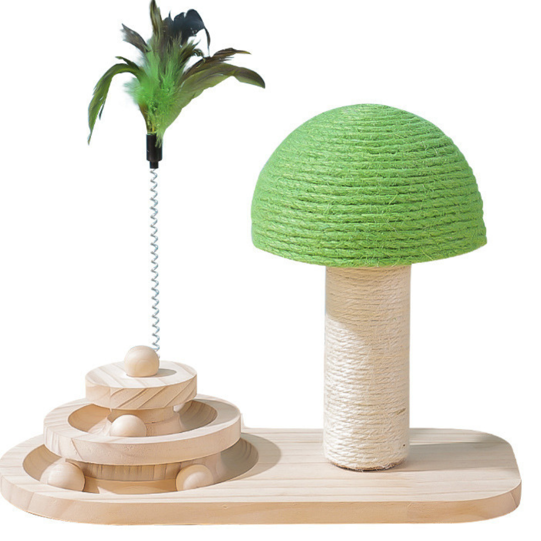 Dette smarte design kombinerer kradsebræt og legetøj i én samlet løsning. Katten kan både hvæsse kløerne og lege med de bevægelige kugler – perfekt til at holde både krop og sind aktivt.