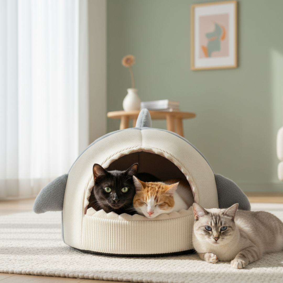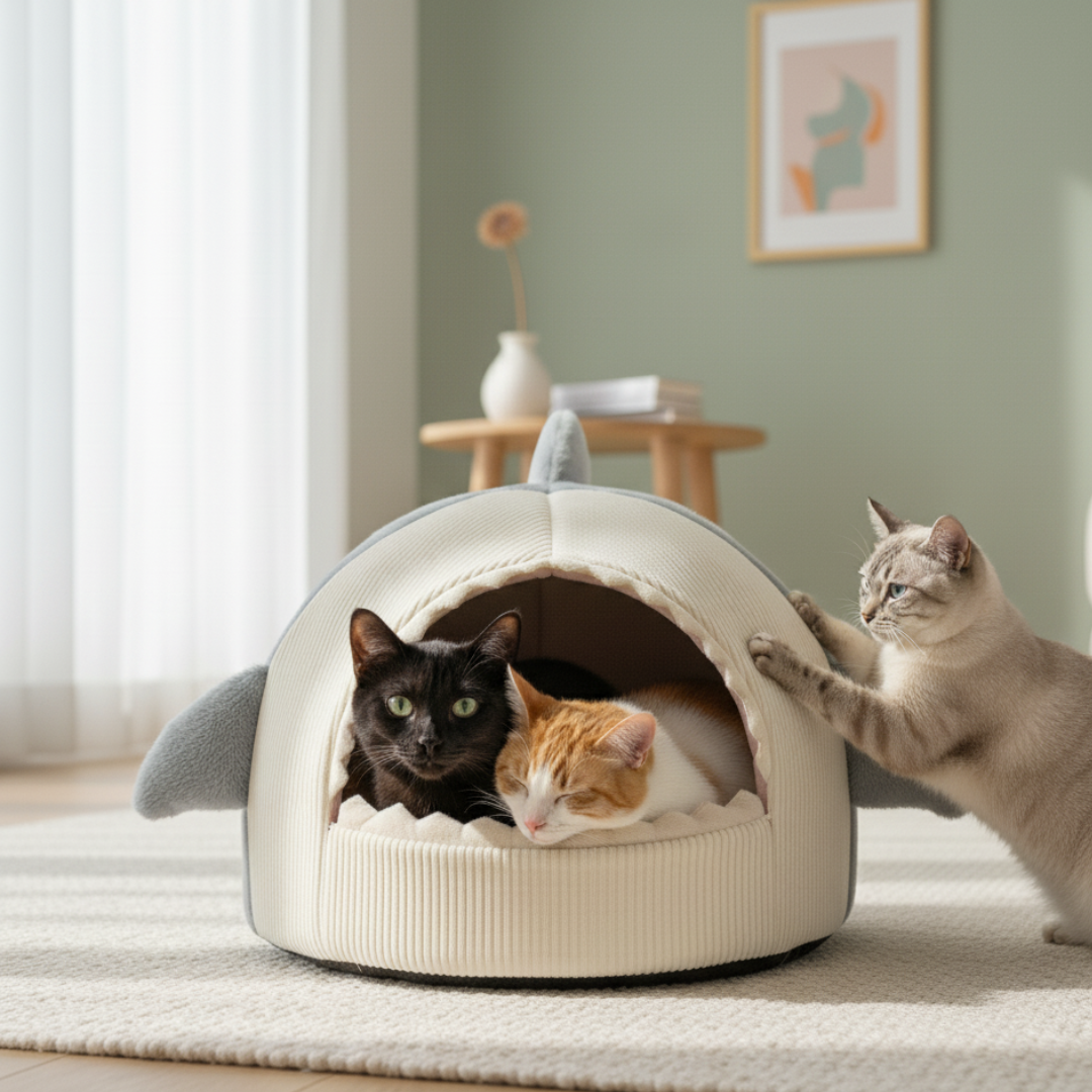 Det ikoniske hajdesign får både katte og ejere til at smile. Den ser godt ud i enhver bolig og fungerer både som seng, hule og legested. Let i vægt, nem at flytte rundt og kan foldes sammen, når den ikke er i brug.